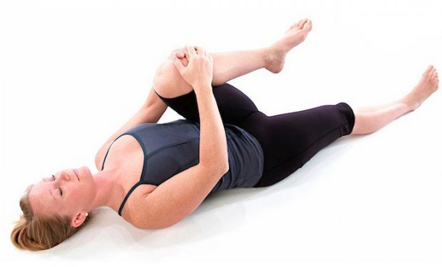 11. Лежа на спине на выдохе потянуть колено к груди и постараться коснуться им пола сбоку соседней ноги (можно помогать себе руками), при этом вторая нога должна тянуться вверх по диагонали. Для каждой ноги достаточно выполнить 10 подходов.